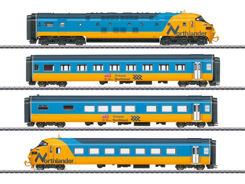 Vorbild: Dieseltriebzug Northlander der Ontario Northland Railway (ONR), Kanada (ehemaliger Dieseltriebzug RAm TEE). 4-teilige Garnitur in himmelblau/gelber Grundfarbgebung. 1 Motorwagen, 1 Abteilwagen, 1 Speisewagen, 1 Großraumwagen mit Steuerabteil. Dieseltriebzug-Nummer 1981. Betriebszustand 1980er Jahre.