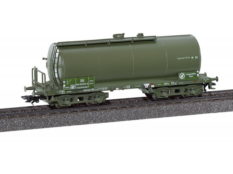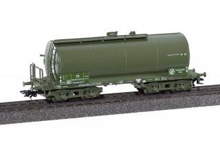 Vorbild: Vierachsiger Einheits-Kesselwagen als Privatwagen des United States Transportation Corps (USTC). Eingestellt bei der Deutschen Bundesbahn (DB). "Ältere Bauart mit Pressblech-Drehgestellen und Bremserbühne. Betriebszustand Mitte der 1950er-Jahre.