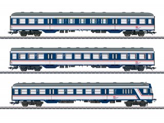 Modell: Typspezifisch gestaltete Unterböden. Drehgestelle mit Scheibenbremse. Separat angesetzte Griffstangen an den Wagenenden. Steuerwagen mit fahrtrichtungsabhängigem Lichtwechsel vom Dreilicht-Spitzensignal auf zwei rote Schlusslichter analog und digital funktionsfähig mittels Schleppschalter. Beleuchtung mit wartungsfreien warmweißen und roten Leuchtdioden (LED). Alle Wagen vorbereitet für den Einbau von stromführenden Kupplungen 72022 und Innenbeleuchtung 73410/73411. Mittelwagen zusätzlich vorbereitet für den Einbau des Schleifers 73406 und der Zugschlussbeleuchtung 73409. Befahrbarer Mindestradius 360 mm. Alle Wagen einzeln verpackt in zusätzlicher Umverpackung. Länge über Puffer 84,6 cm.Gleichstromradsatz (Mittelwagen) E700580. Trix-Express-Radsatz (Mittelwagen) E33357811.