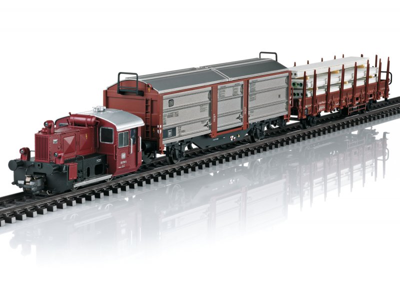 Modell: Diesellokomotive mit Digital-Decoder mfx+ und umfangreichen Geräuschfunktionen. 2 Achsen angetrieben. Mit Gleishaftmagneten zur Zugkraftverbesserung. Telex-Kupplung vorne und hinten jeweils separat digital schaltbar. Fahrtrichtungsabhängig wechselndes Dreilicht-Spitzensignal und zwei rote Schlusslichter konventionell in Betrieb, digital schaltbar. Spitzensignal an Lokseite 1 und 2 jeweils separat digital schaltbar. Wenn Rangiergang aktiviert oder Spitzensignal an beiden Lokseiten abgeschaltet, dann beidseitige Funktion des Doppel-A-Lichtes. Separat angesetzte Metallgriffstangen. Schiebedach-/Schiebewandwagen mit separat angesetzten stirnseitigen Bühnen. Kbs mit Beladung und abnehmbaren Rungen. Die Rungen liegen bei. Gesamtlänge über Puffer ca. 39,5 cm.